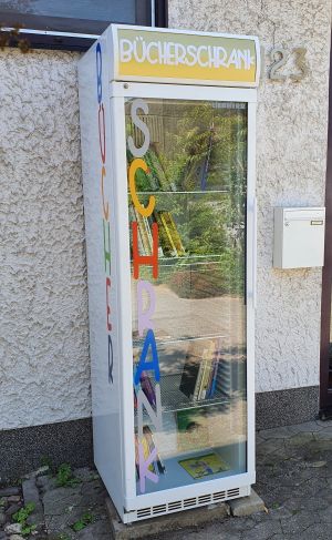 Wie durch ein Wunder war die Suche schnell erfolgreich und sogar kostenlos. Passend von Ivonne dekoriert steht der Bücherkühlschrank jetzt vor dem Eingang des Gemeindezentrums und wartet auf kleine und große Leseratten, die Bücher entnehmen und welche dazu stellen.